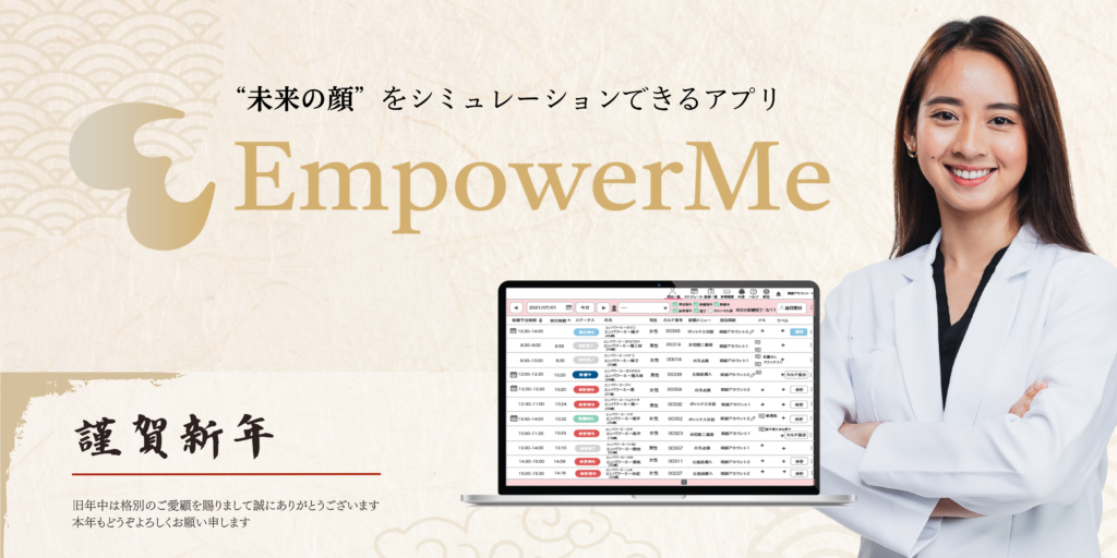 『エンパワーミー』は、国内特許取得済のエイジングケア・美容医療・施術予約アプリです。美容医療技術から誕生した自分の”未来の顔”をシミュレーションできるのが特徴です。AI技術でユーザー様の顔をゼロから生成することができ、ユーザー様のお悩みに合ったクリニックを選んで、特別メニューとポイント還元で予約することができます。また、AIシミュレーションだけでなく、エイジングケアコスメの購入も可能です。