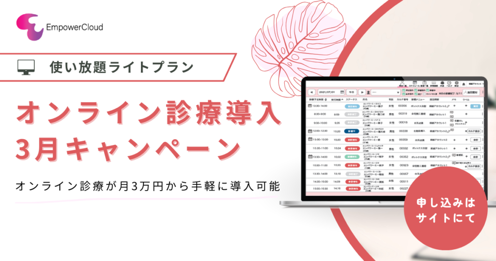 平素より当サービスをご利用いただき、誠にありがとうございます。 このたび、オンライン診療システム「EmpowerCloud」では、**2026年3月限定「オンライン診療導入キャンペーン」**を実施いたします。 新年度を迎えるこのタイミングで、オンライン診療の導... -